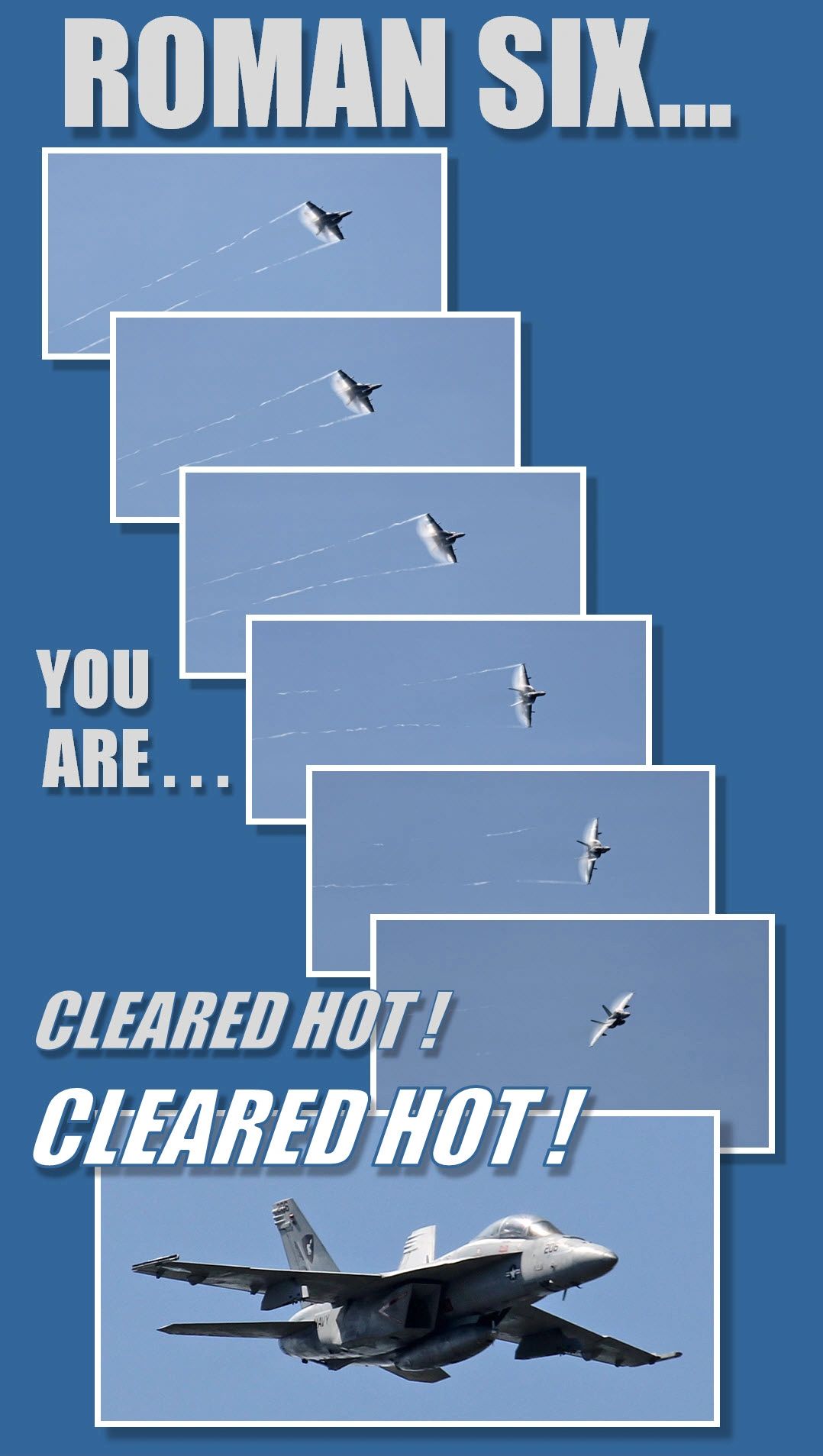 'Just a typical day at the office'. The intense, high-G pull imposed on this F/A-18F squeezes vapour out of the air as ROMAN SIX selects full afterburner to clear the target area.